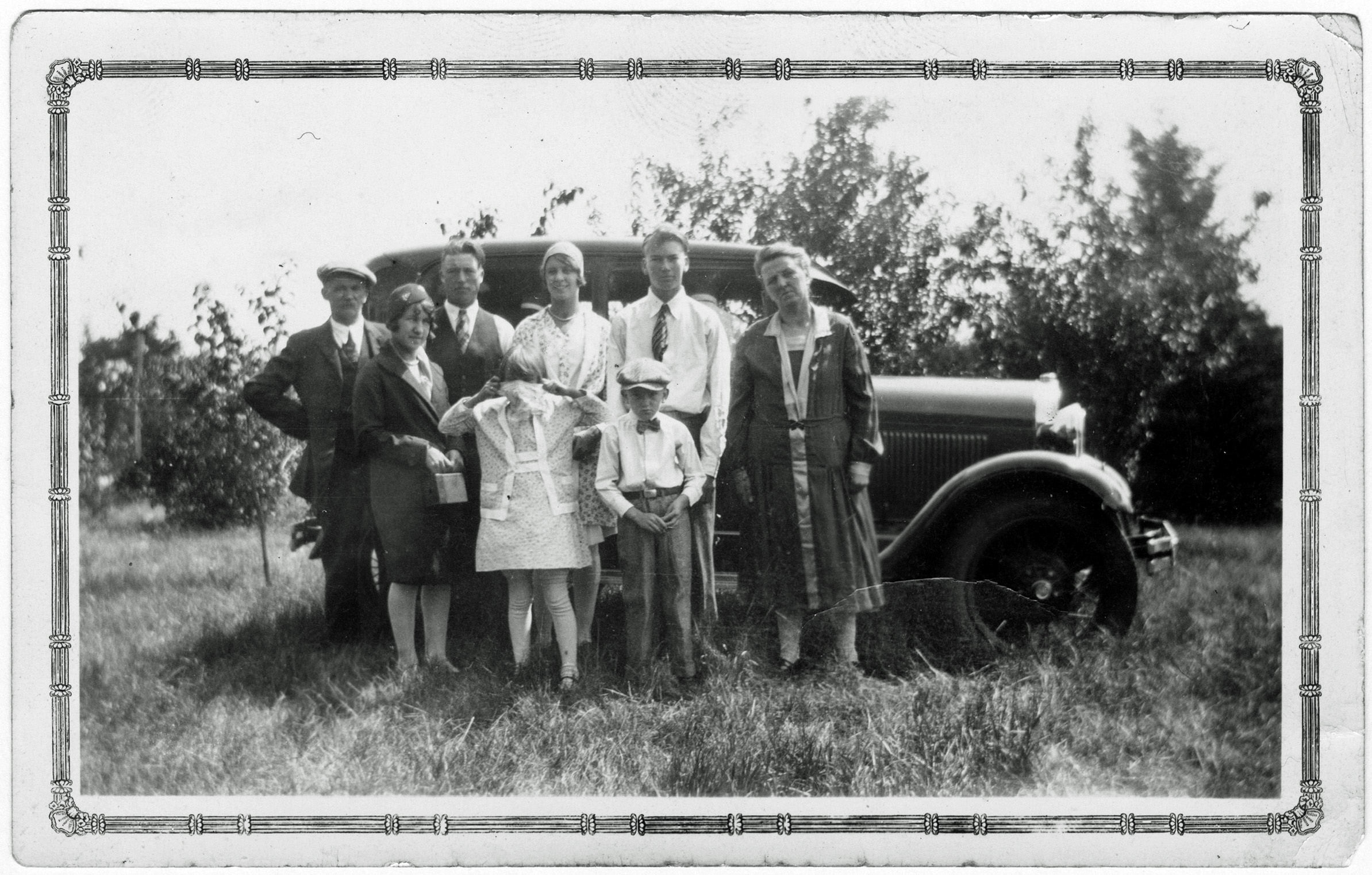 Eight people stand in front of a car in a field with trees in the background. In the back row, the dapper man on the left with the mustache is my grandfather. He is wearing a three piece suit, tie and a golf-style cap. At the far right is my grandmother in a dress decorated with what appears to be satin. White stockings contrast with her sensible shoes.