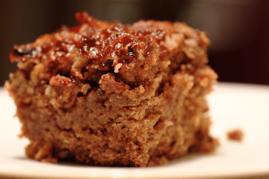 Blend in the eggs and vanilla and stir in the oatmeal. Sift the flour, baking soda, salt and spices into the creamed mixture. Mix the batter well and pour it into the greased pan and bake the cake for fifty to fifty-five minutes. Test for doneness after fifty minutes. A toothpick stuck near the center of the cake should come out clean when the cake is done.