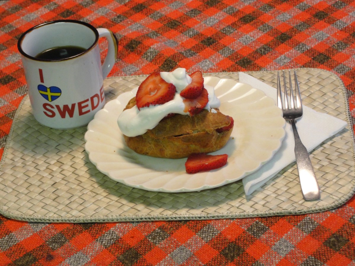 He scowled and shook his head and kept his mouth clamped shut. However, when I put a couple more slices of strawberry topped with whipped cream into his bowl, he shoveled them in and grinned at me. Now I am more determined than ever that he will learn to like my cream puffs.