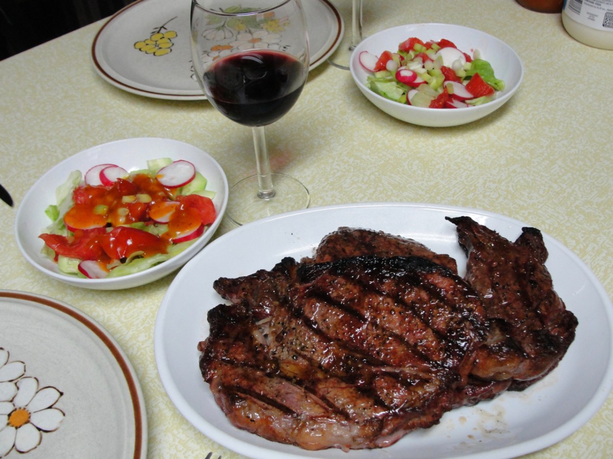 Many of our guests compliment me on the steaks, so we must be doing something right. Of course, it might be that my inability to get dinner done on time is the explanation. As Socrates is supposed to have observed 2,500 years ago, “The best sauce for food is hunger.”